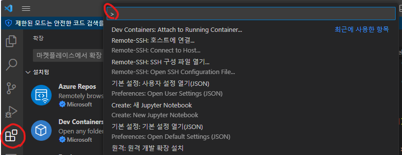 설치 목록 : Remote - SSH , Dev Containers, Remote Development