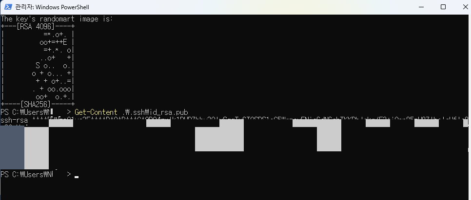 발급된 키 내용을 확인하기 위해서는 키가 발급된 해당 경로로 직접 가서 파일(.ssh\id_rsa.pub)을 열어 확인하는 방법과,